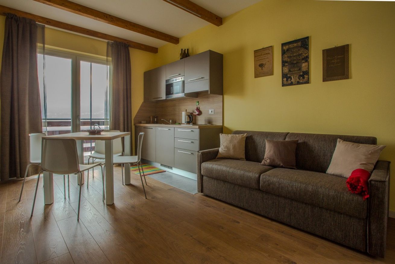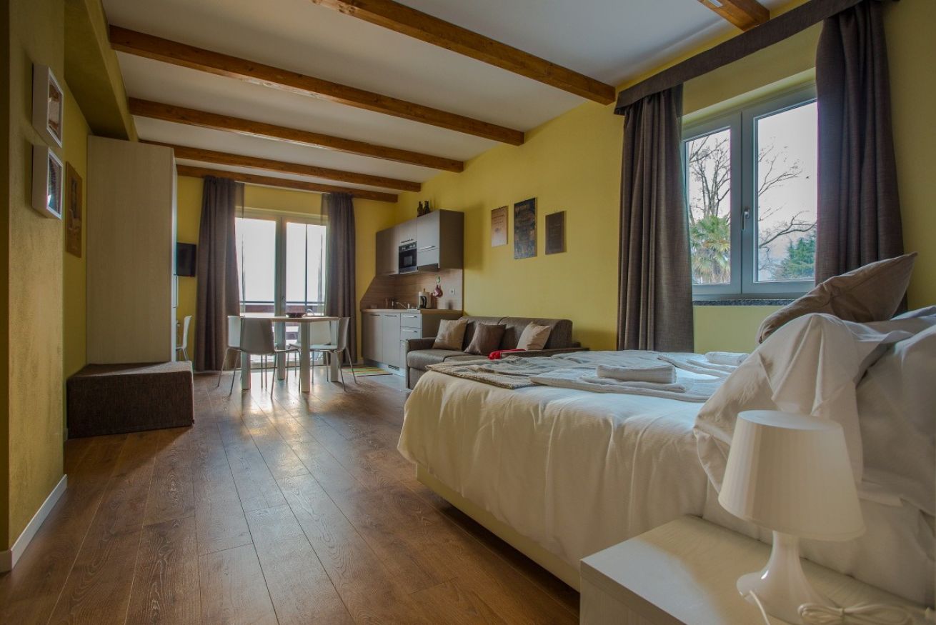 Bathroom with shower, hairdryer and towel set; kitchen with refrigerator, microwave, stove (glassceramic), kettle, mocha, cutlery; wardrobe; table and chairs; double bed, single pouf bed; sheets; 32'satellite LCD TV; Free Wi-Fi network; self-heating and cooling; private lake view balcony with table and chairs.