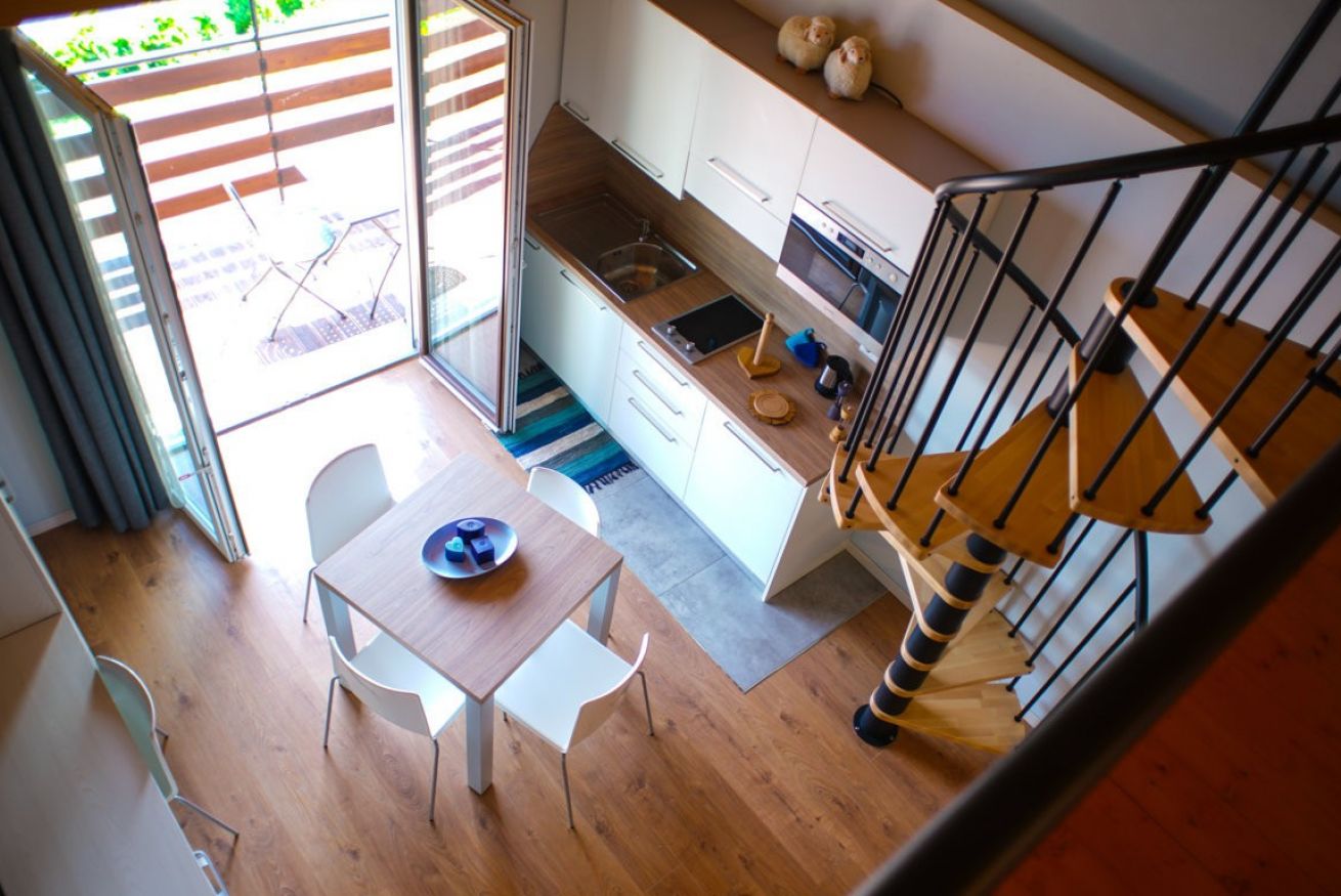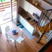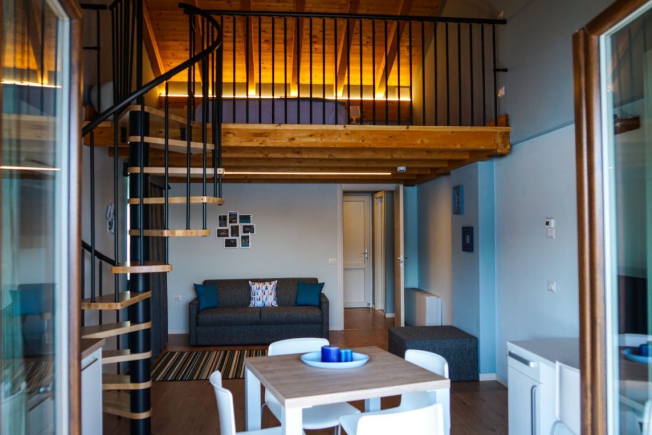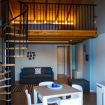 Apartment with loft, connected to the area below from spiral staircase.